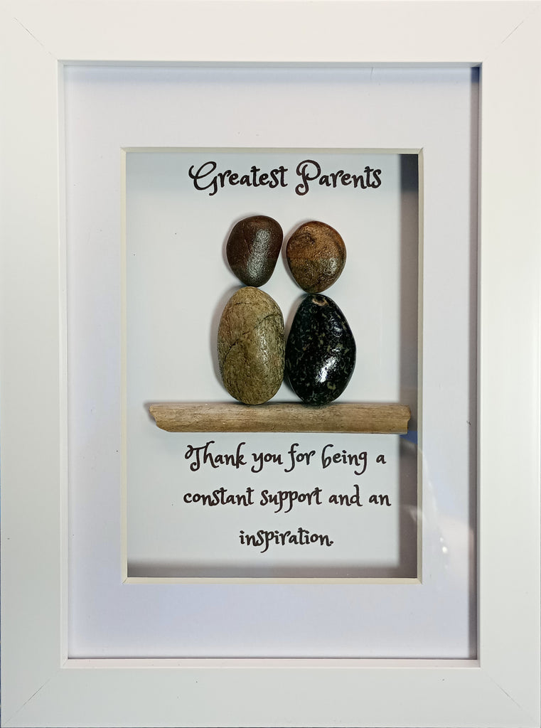 Greatest Parents. Features 2 pebble people sitting on driftwood. Captions: Greatest Parents, Thank you for being a constant support and an inspiration. Set in a modern shadow box frame that can be table mounted or hung on the wall. Frame size: 20.5cm x 15.5cm x 3cm. Picture was created using pebbles and driftwood hand-picked at local Irish beaches. All our pebbles are responsibly sourced.