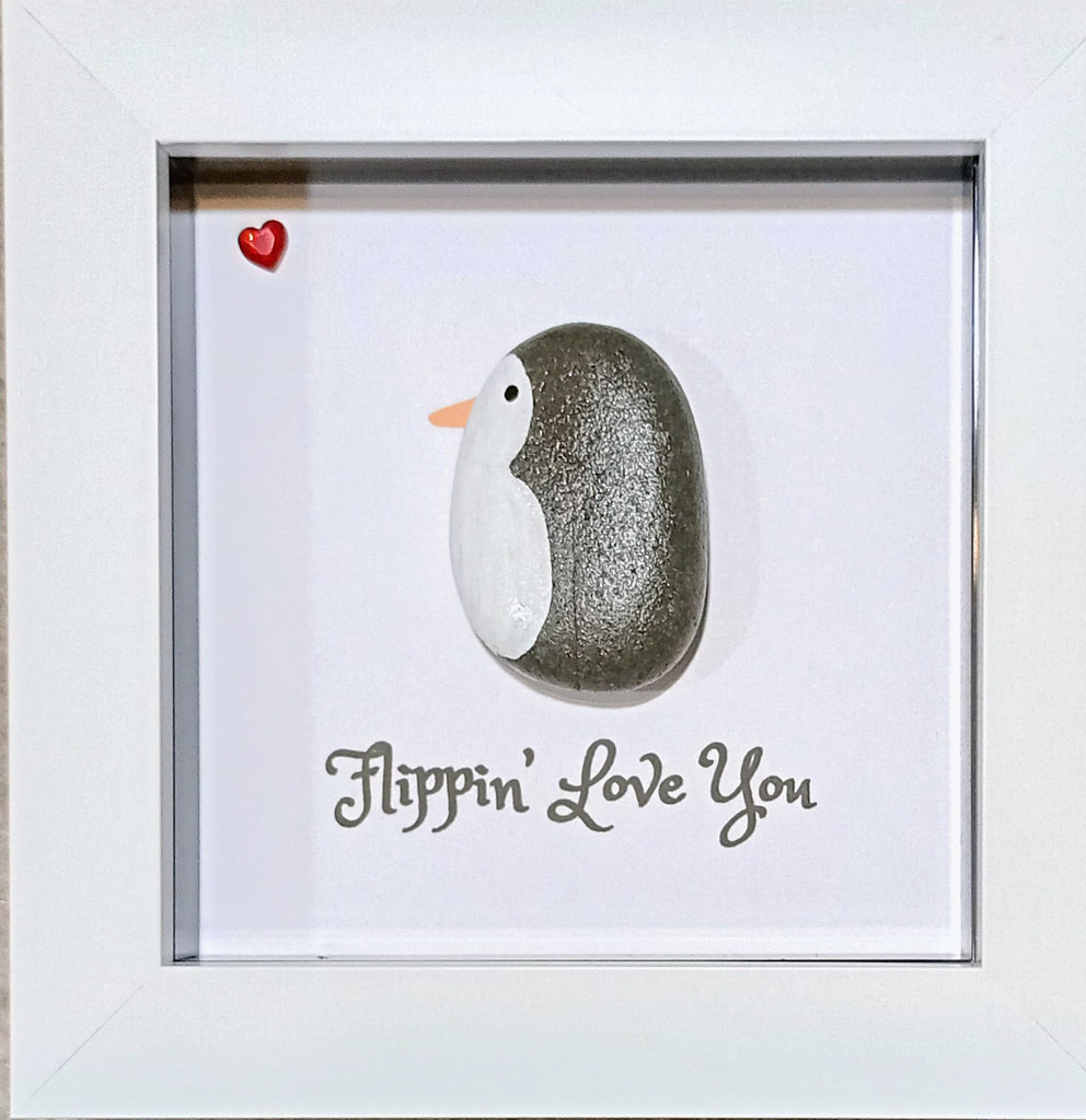 Cute little penguin rock. Caption reads: "Flippin' love you." Set in an acrylic box frame. Frame size: 10cm x 10cm x 3cm