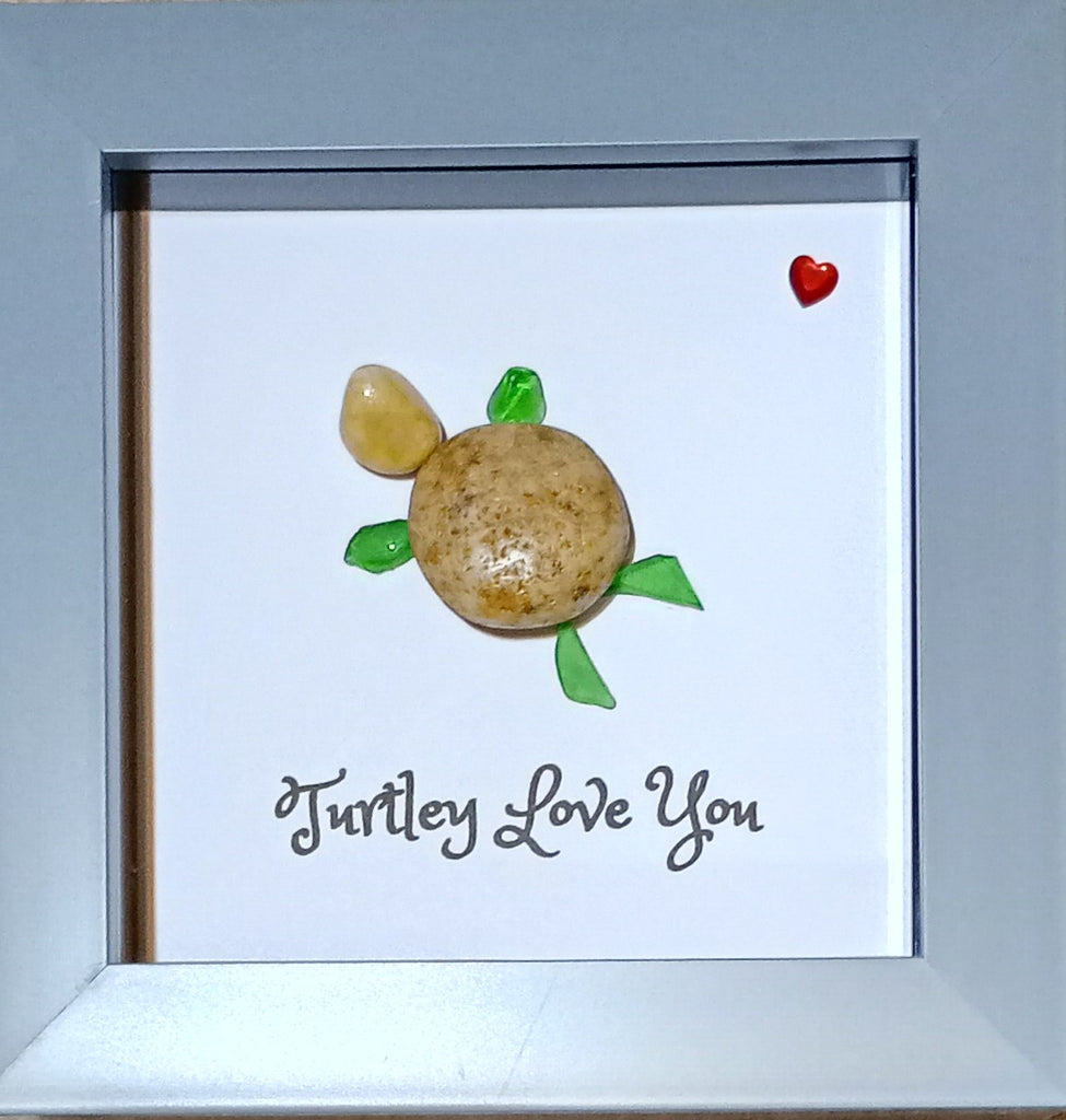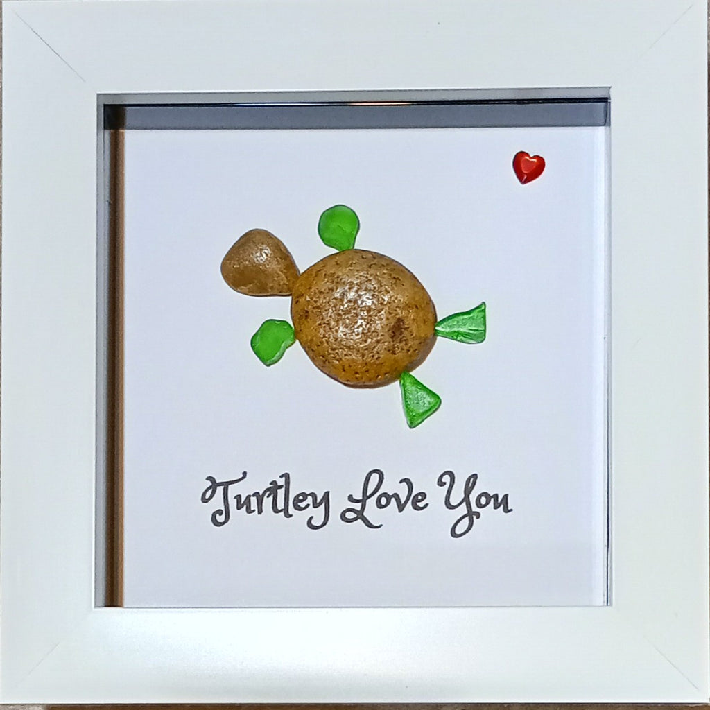 Cute little turtle made from a pebble and sea-glass. Caption reads: "Turtley love you." Set in an acrylic box frame. Frame size: 10cm x 10cm x 3cm